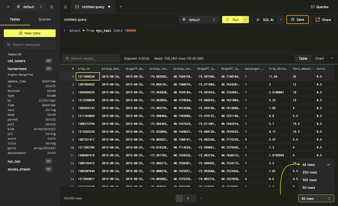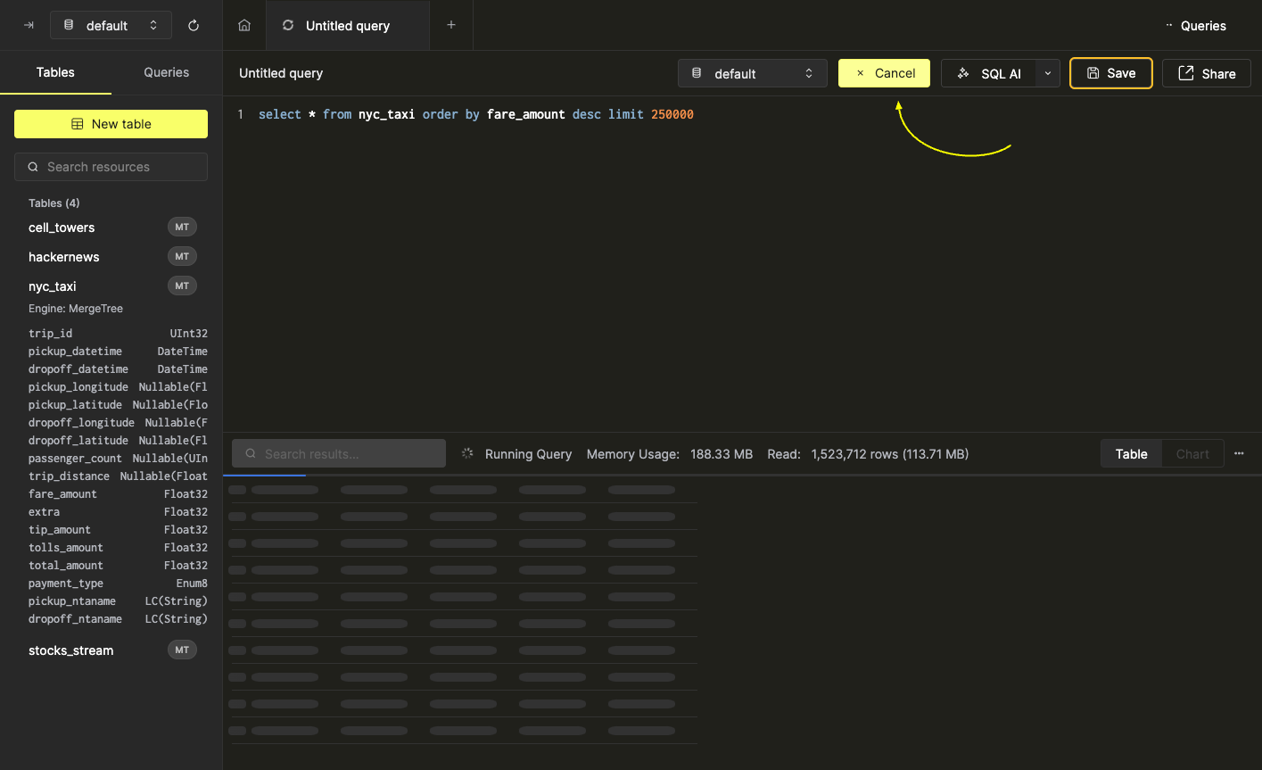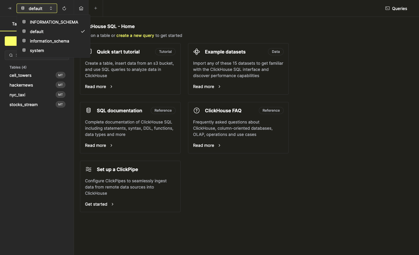 Обзор таблиц, содержащихся в вашей инстанции ClickHouse, можно найти в области левой боковой панели. Используйте селектор базы данных в верхней части левой панели, чтобы просмотреть таблицы в конкретной базе данных.