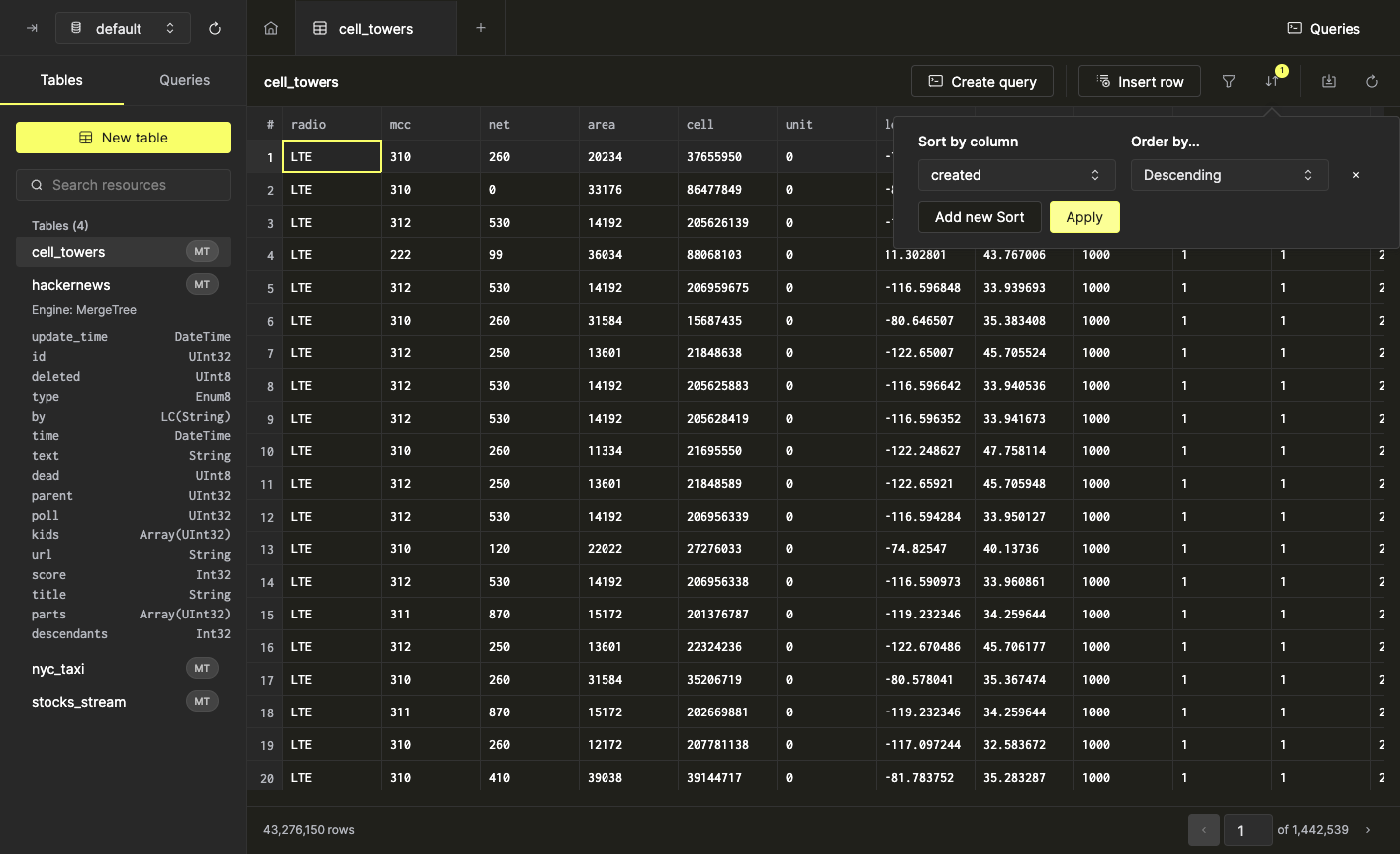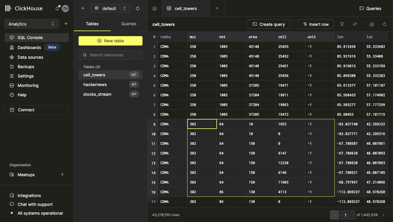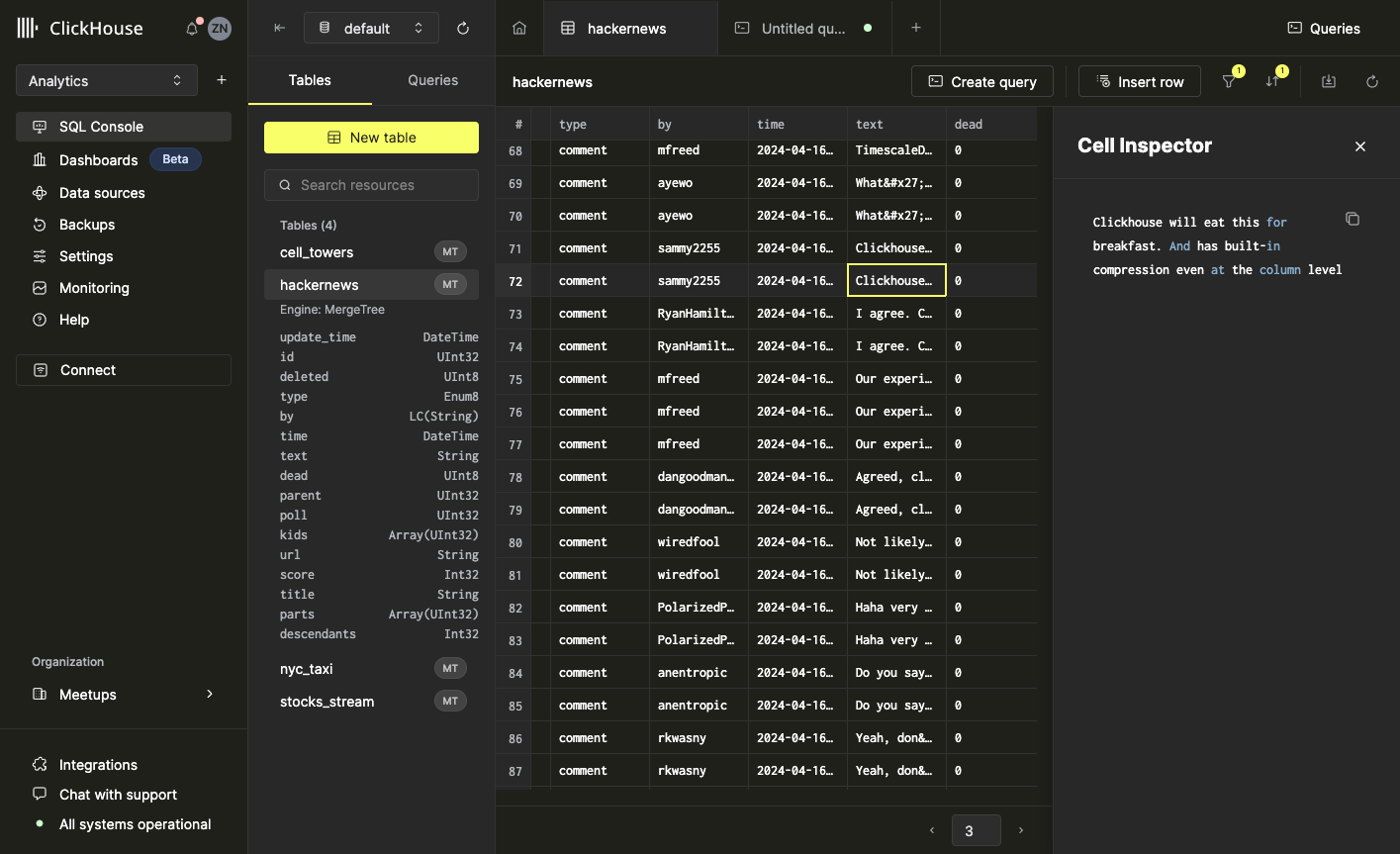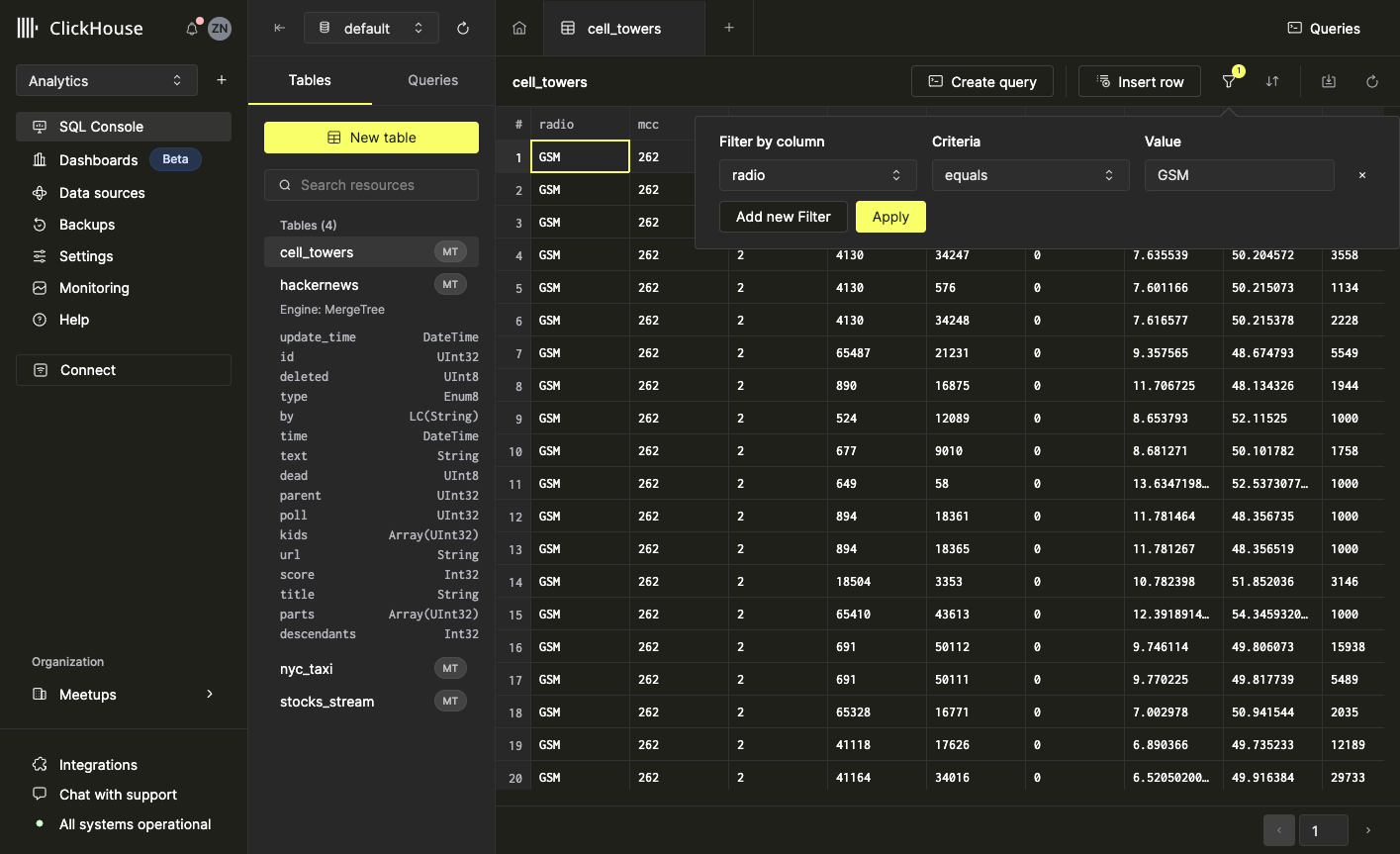 Обзор таблиц, содержащихся в вашей инстанции ClickHouse, можно найти в области левой боковой панели. Используйте селектор базы данных в верхней части левой панели, чтобы просмотреть таблицы в конкретной базе данных.