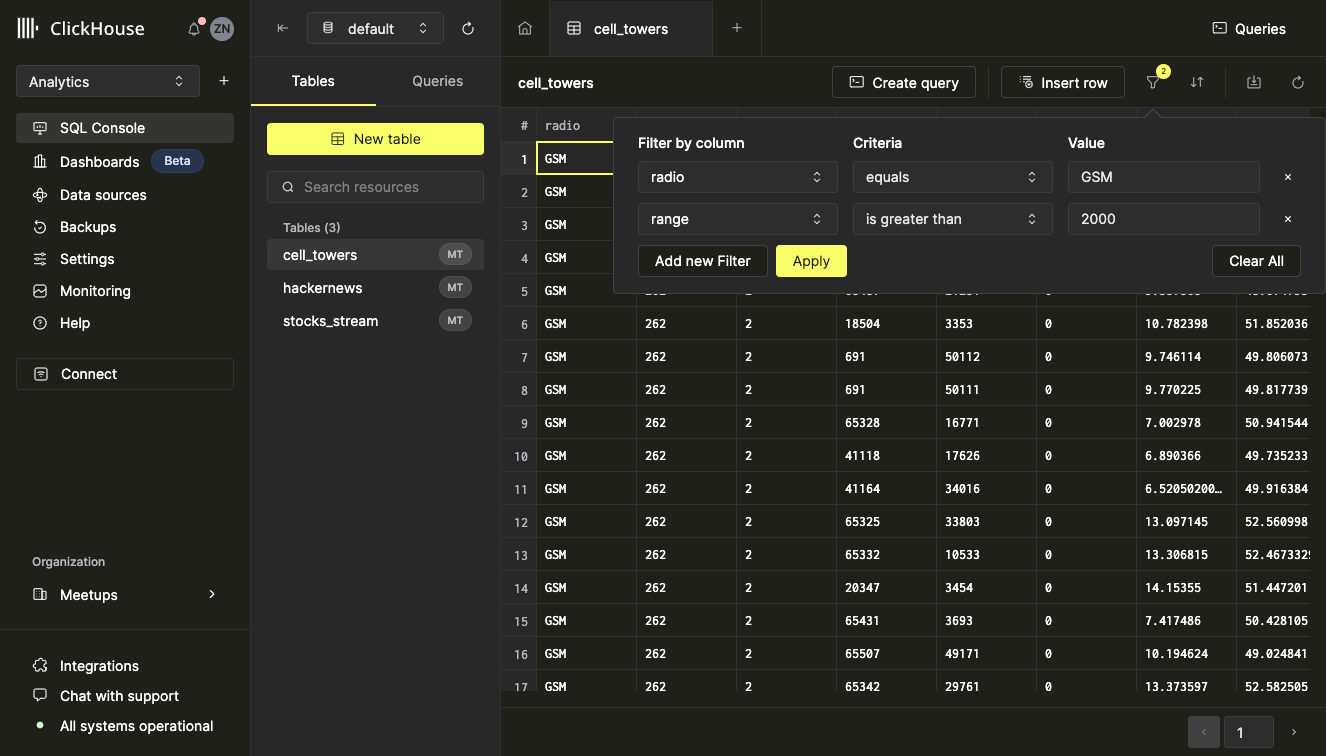 SQL консоль позволяет одновременно фильтровать и сортировать таблицу. Для этого добавьте все желаемые фильтры и сортировки с помощью описанных выше шагов и нажмите кнопку 'Применить'.