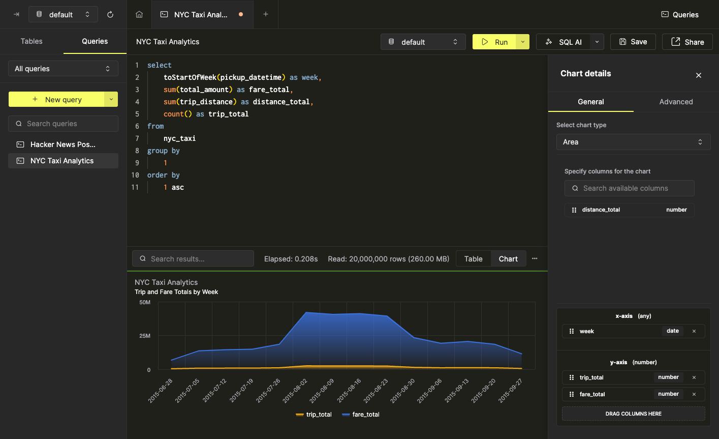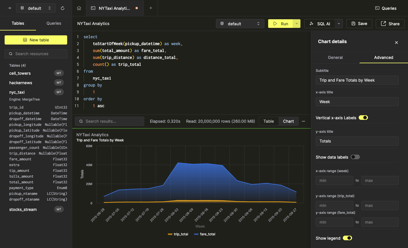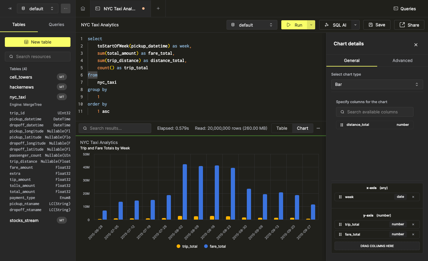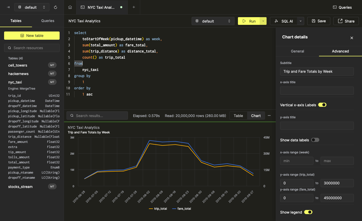 Некоторые данные могут быть легче интерпретированы в виде графика. Вы можете быстро создавать визуализации из данных результатов запроса прямо из SQL консоли всего за несколько кликов. В качестве примера мы будем использовать запрос, который рассчитывает еженедельную статистику для поездок такси в Нью-Йорке: