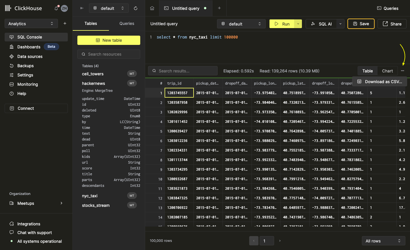 Наборы результатов запроса можно легко экспортировать в формат CSV прямо из SQL консоли. Для этого откройте меню ••• на правой стороне панели инструментов результатов и выберите 'Скачать как CSV'.