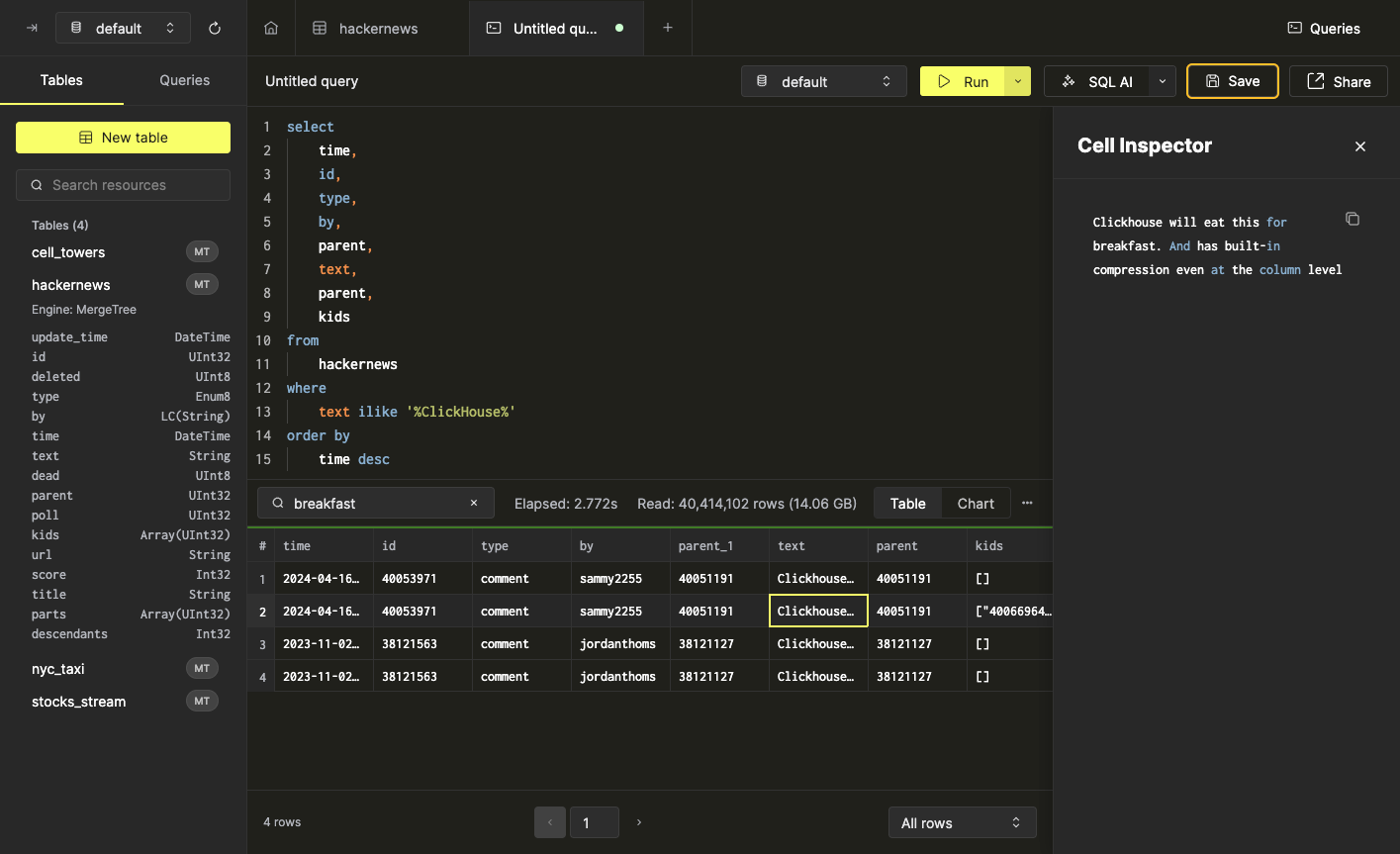 После выполнения запроса вы можете быстро искать по возвращенному набору результатов, используя поле поиска в панели результатов. Эта функция помогает предварительно просматривать результаты дополнительного условия WHERE или просто проверять, чтобы убедиться, что конкретные данные включены в набор результатов. После ввода значения в поле поиска панель результатов обновится и вернет записи, содержащие элемент, соответствующий введенному значению. В этом примере мы будем искать все экземпляры breakfast в таблице hackernews для комментариев, содержащих ClickHouse (не учитывается регистр):