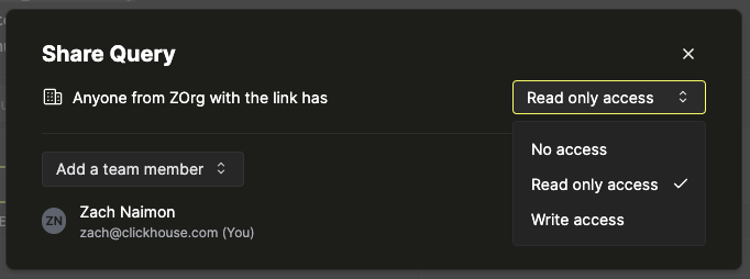 Чтобы настроить доступ к запросу для всех членов организации с доступом к службе, просто измените селектор уровня доступа в верхней строке: