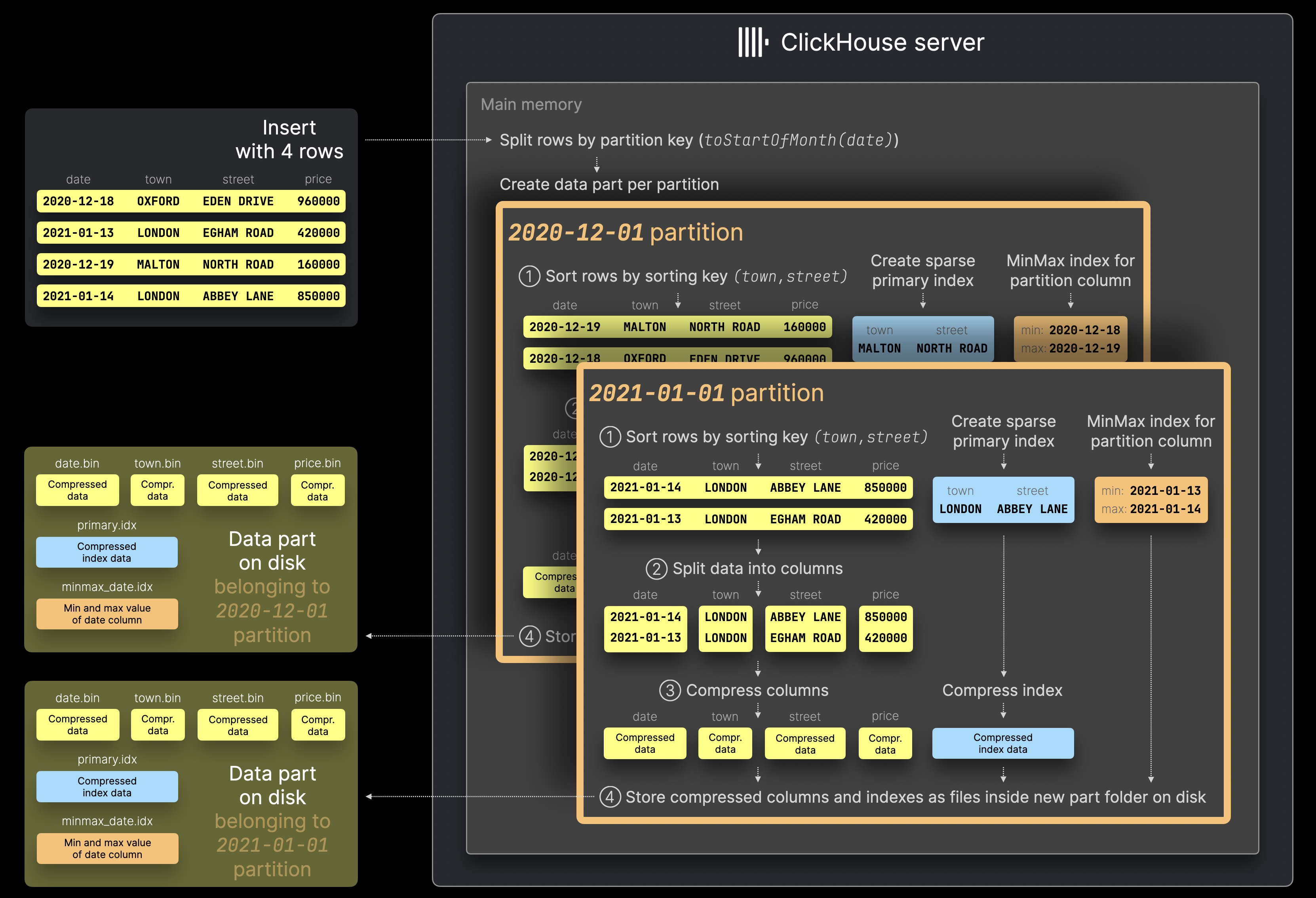 Сервер ClickHouse сначала делит строки из примера вставки с 4 строками, изображенными на диаграмме выше, по значениям их ключа партиционирования toStartOfMonth(date). Затем для каждой идентифицированной партиции строки обрабатываются как обычно путем выполнения нескольких последовательных шагов (① Сортировка, ② Деление на колонки, ③ Сжатие, ④ Запись на диск).