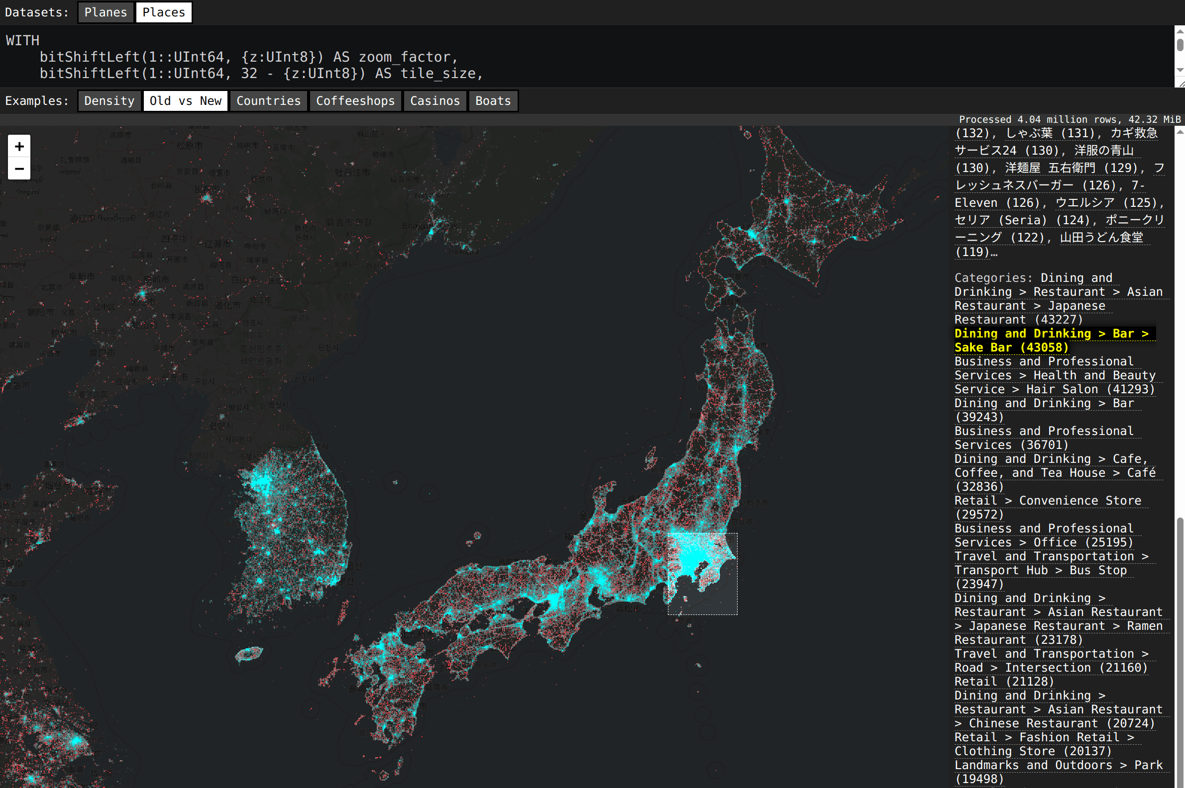 Чтобы увидеть, что возможно с этим набором данных, ознакомьтесь с adsb.exposed. adsb.exposed был изначально создан соучредителем и техническим директором Алексеем Миловидовым для визуализации данных о полётах ADS-B (Автоматическая зависимая наземная служба радиосвязи), которые в 1000 раз больше. Во время хакатона компании Алексей добавил данные Foursquare в инструмент.