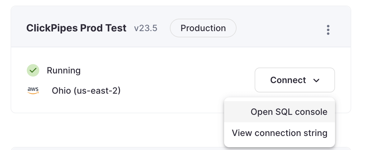 - В консоли ClickHouse Cloud перейдите к вашему сервису ClickHouse Cloud.
