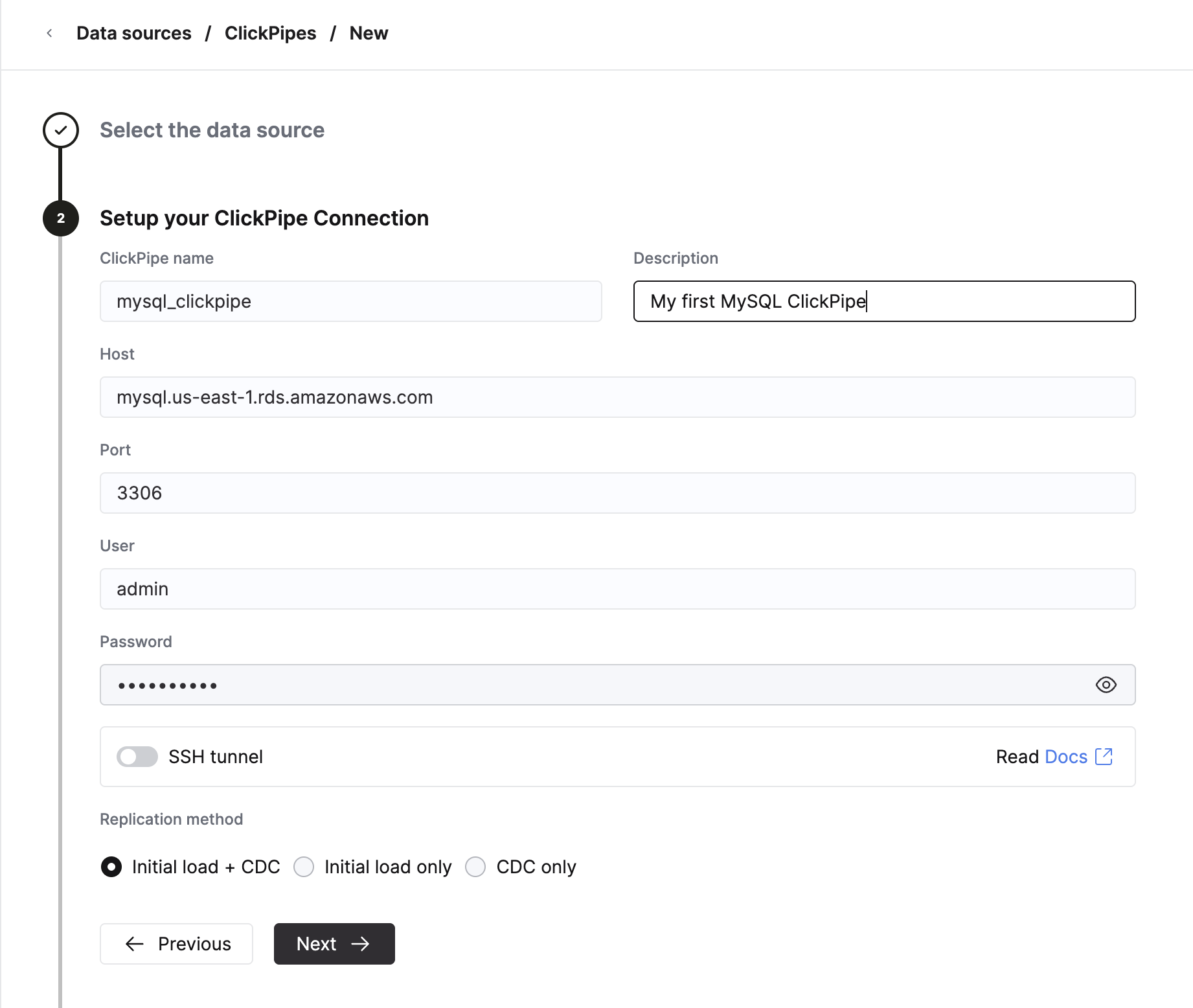 После настройки вашей исходной базы данных MySQL вы можете продолжить создавать ваш ClickPipe.