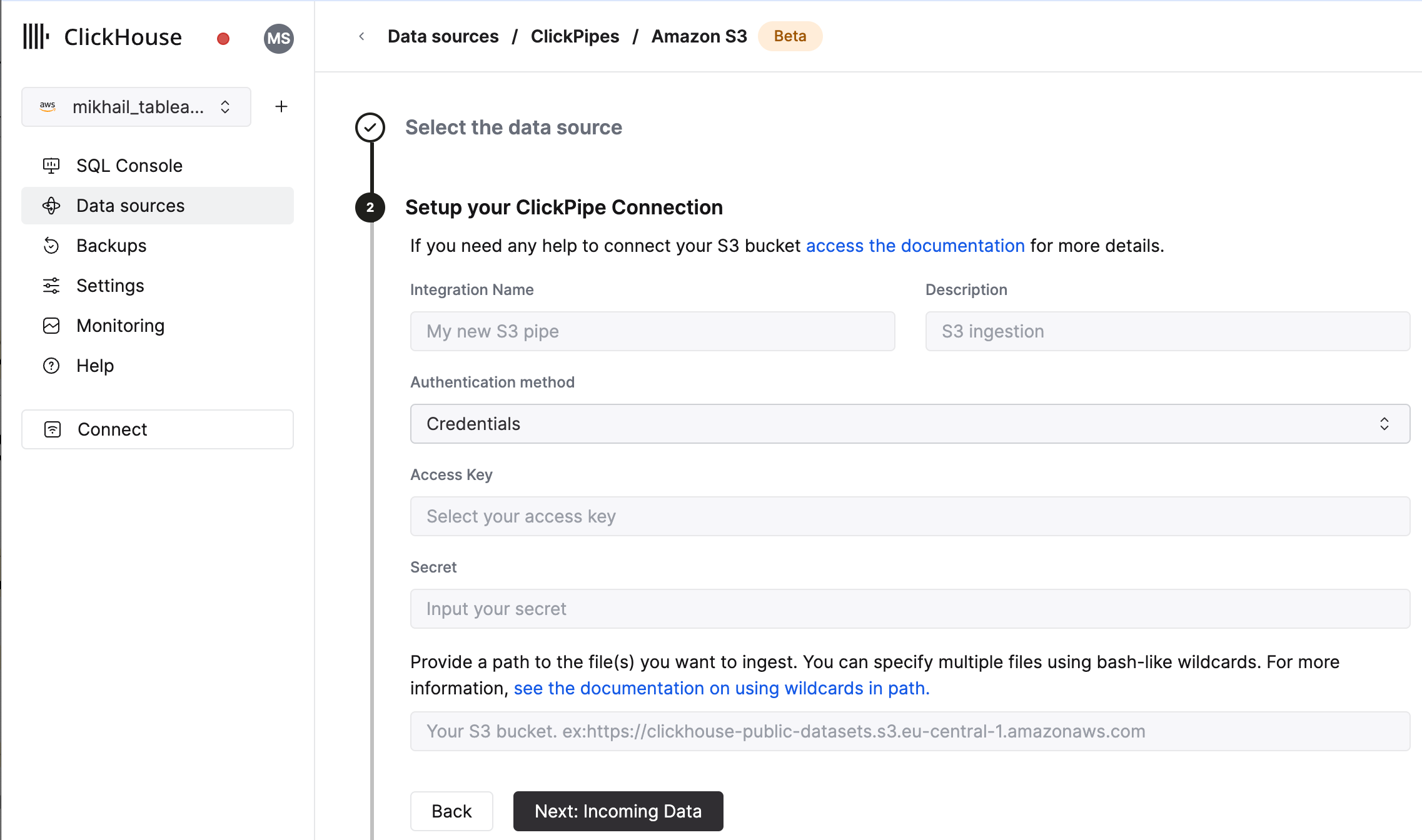 Вы можете получить доступ к открытым ведрам без настройки, а для защищенных ведер вы можете использовать IAM учетные данные или IAM роль. Чтобы использовать IAM роль, вам необходимо создать IAM роль, как указано в этом руководстве. Скопируйте новый IAM ARN после создания и вставьте его в конфигурацию ClickPipe как "IAM ARN роль".