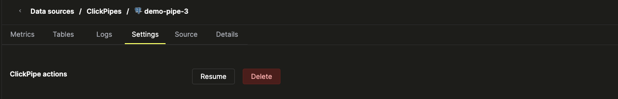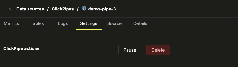 - На вкладке Источники данных нажмите на Postgres ClickPipe, который вы хотите приостановить.