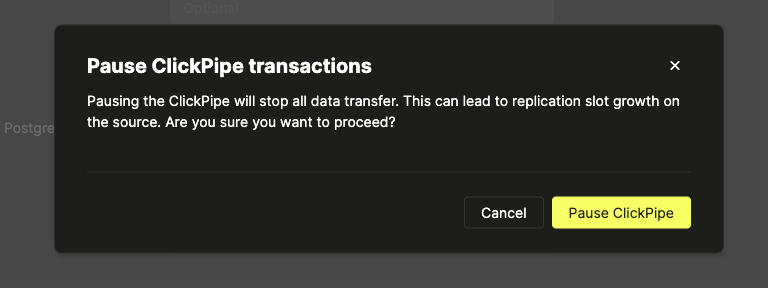 Существуют сценарии, в которых полезно приостановить Postgres ClickPipe. Например, вы можете захотеть провести анализ существующих данных в статическом состоянии. Или вы можете проводить обновления Postgres. Вот как вы можете приостановить и возобновить Postgres ClickPipe.