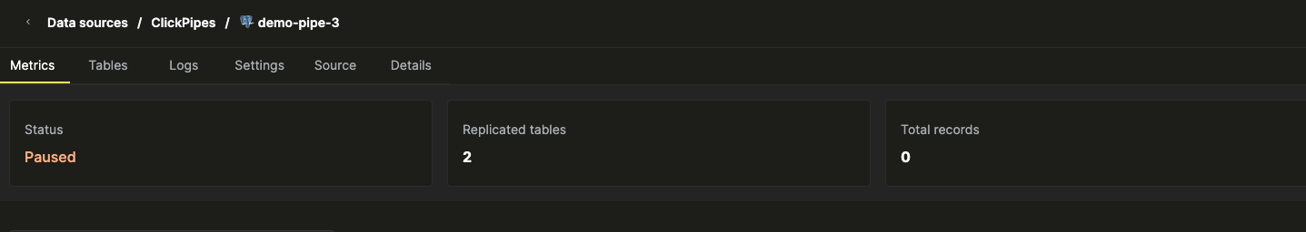 - На вкладке Источники данных нажмите на Postgres ClickPipe, который вы хотите возобновить. Статус зеркала должен быть изначально Приостановлено.