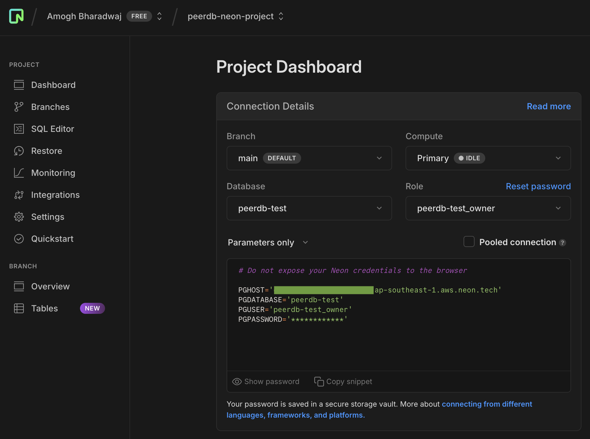 Теперь, когда у нас есть пользователь, публикация и включенная репликация, мы можем скопировать детали соединения, чтобы создать новый ClickPipe. Перейдите на Dashboard и в текстовом поле, где отображается строка соединения, измените вид на Parameters Only. Эти параметры нам понадобятся на следующем этапе.