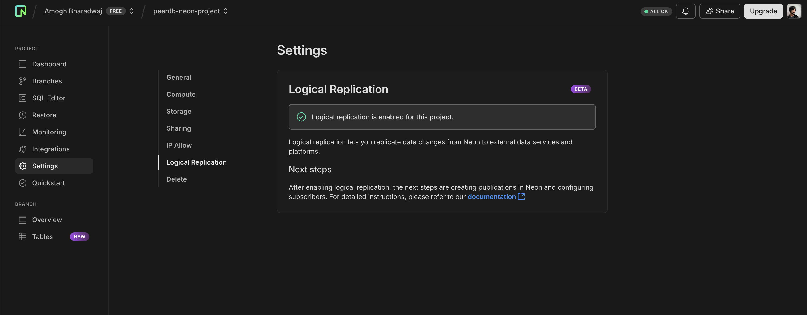 В Neon вы можете включить логическую репликацию через интерфейс. Это необходимо для репликации данных в CDC ClickPipes. Перейдите на вкладку Settings, а затем в раздел Logical Replication.