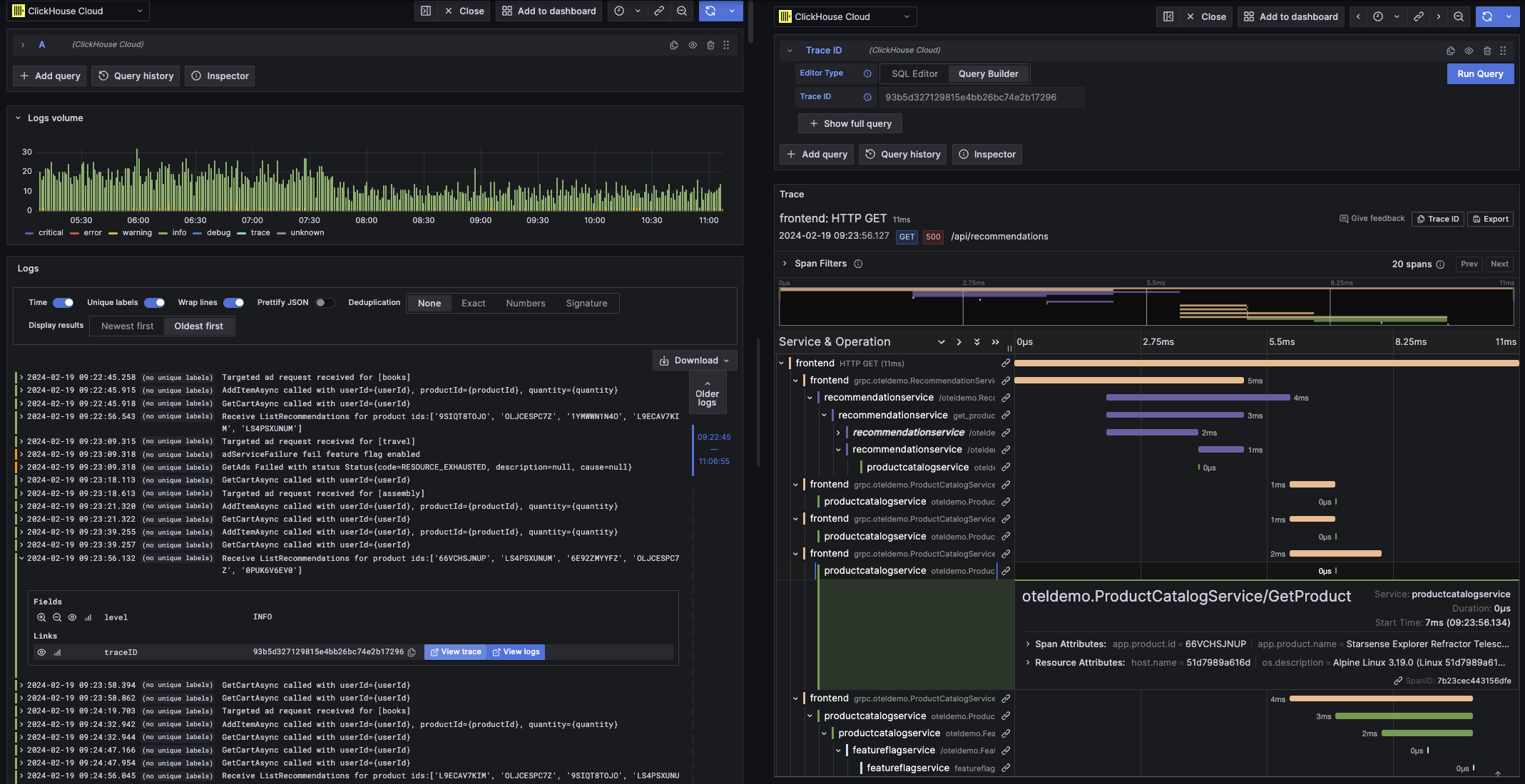 "View Trace" откроет разделённую панель с трассой, а "View Logs" откроет запрос логов, отфильтрованный по ID трассы. Если ссылка нажата из панели инструментов, а не из режима исследования, ссылка будет открыта в новой вкладке в режиме исследования.