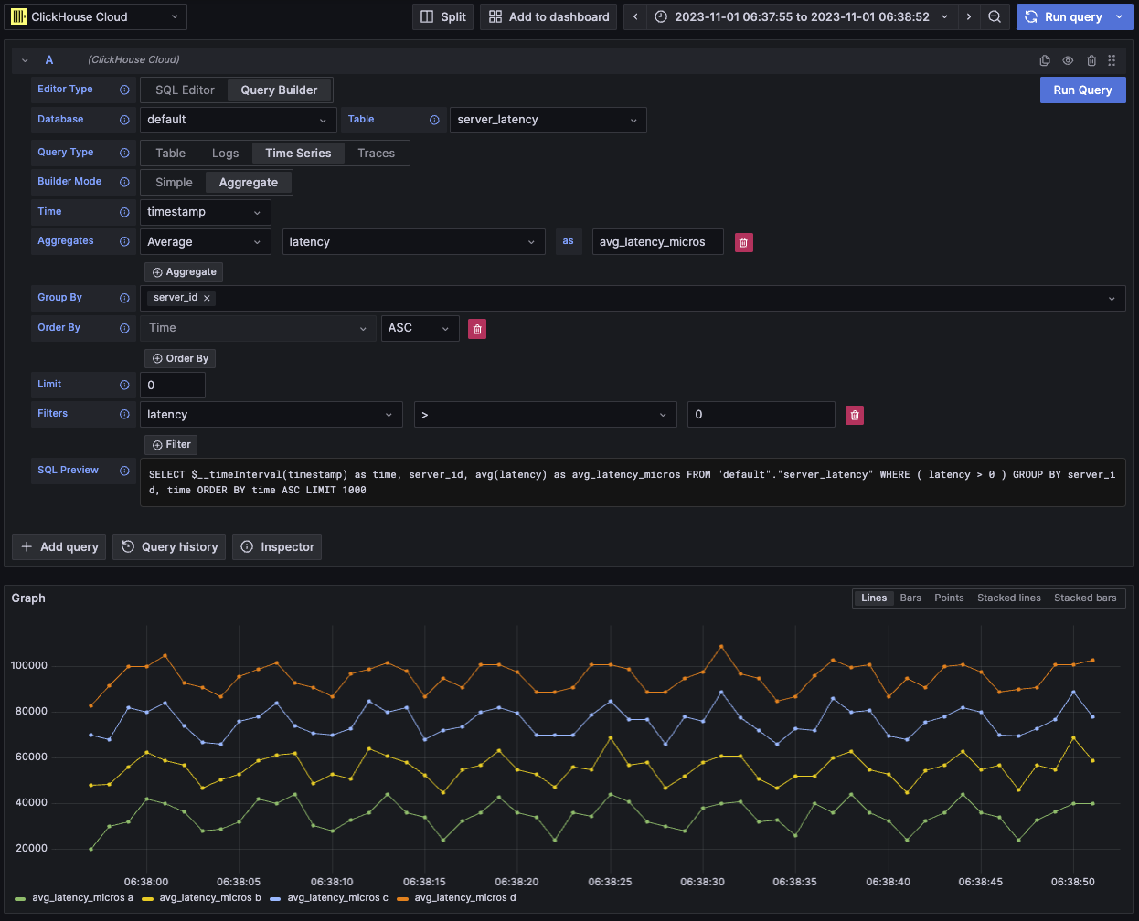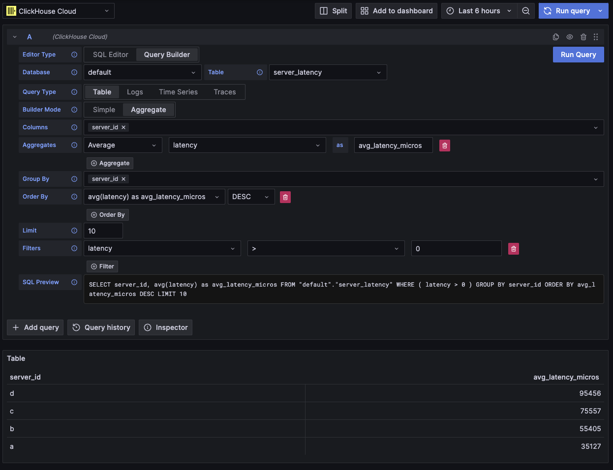 Любой запрос можно выполнить с помощью плагина ClickHouse. Конструктор запросов является удобным вариантом для простых запросов, но для сложных запросов вам понадобится использовать SQL Editor.