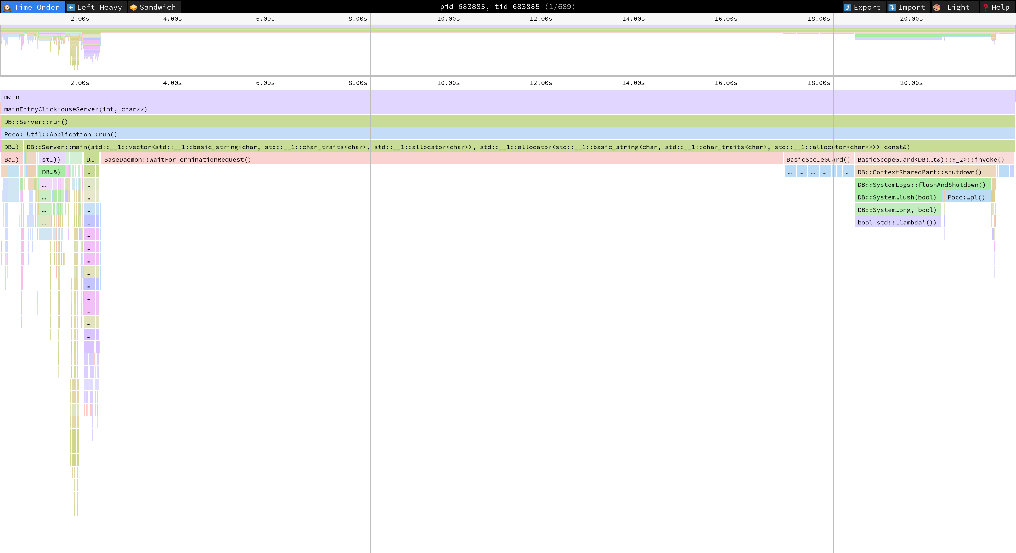 3. Convert the trace to an interesting format such as trace event: llvm-xray convert --symbolize --instr_map=./build/programs/clickhouse --output-format=trace_event xray-log.clickhouse.ZqKprE | gzip > clickhouse-trace.txt.gz.