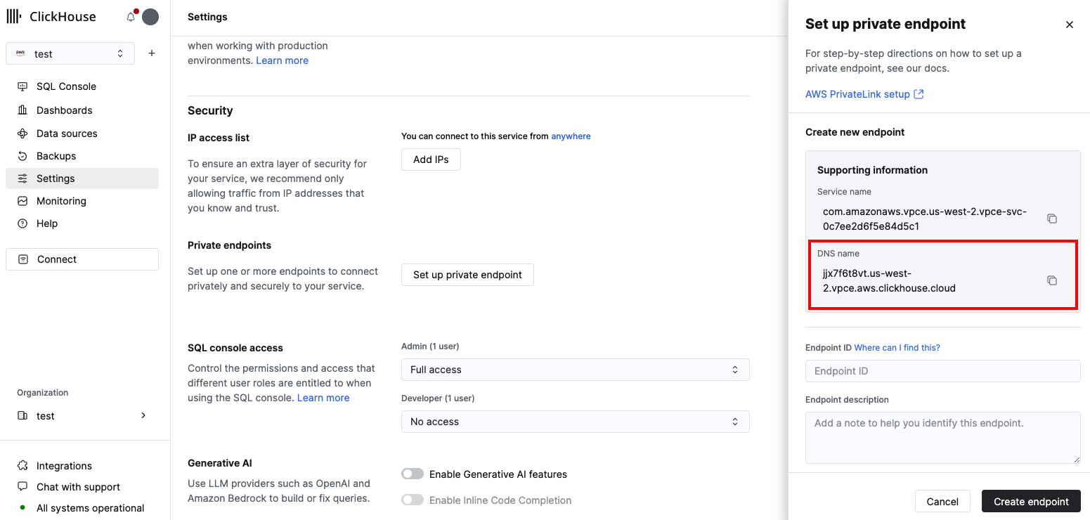 В консоли ClickHouse Cloud перейдите в Настройки. Нажмите кнопку Настроить частную конечную точку. В открывшемся окне скопируйте Имя DNS.