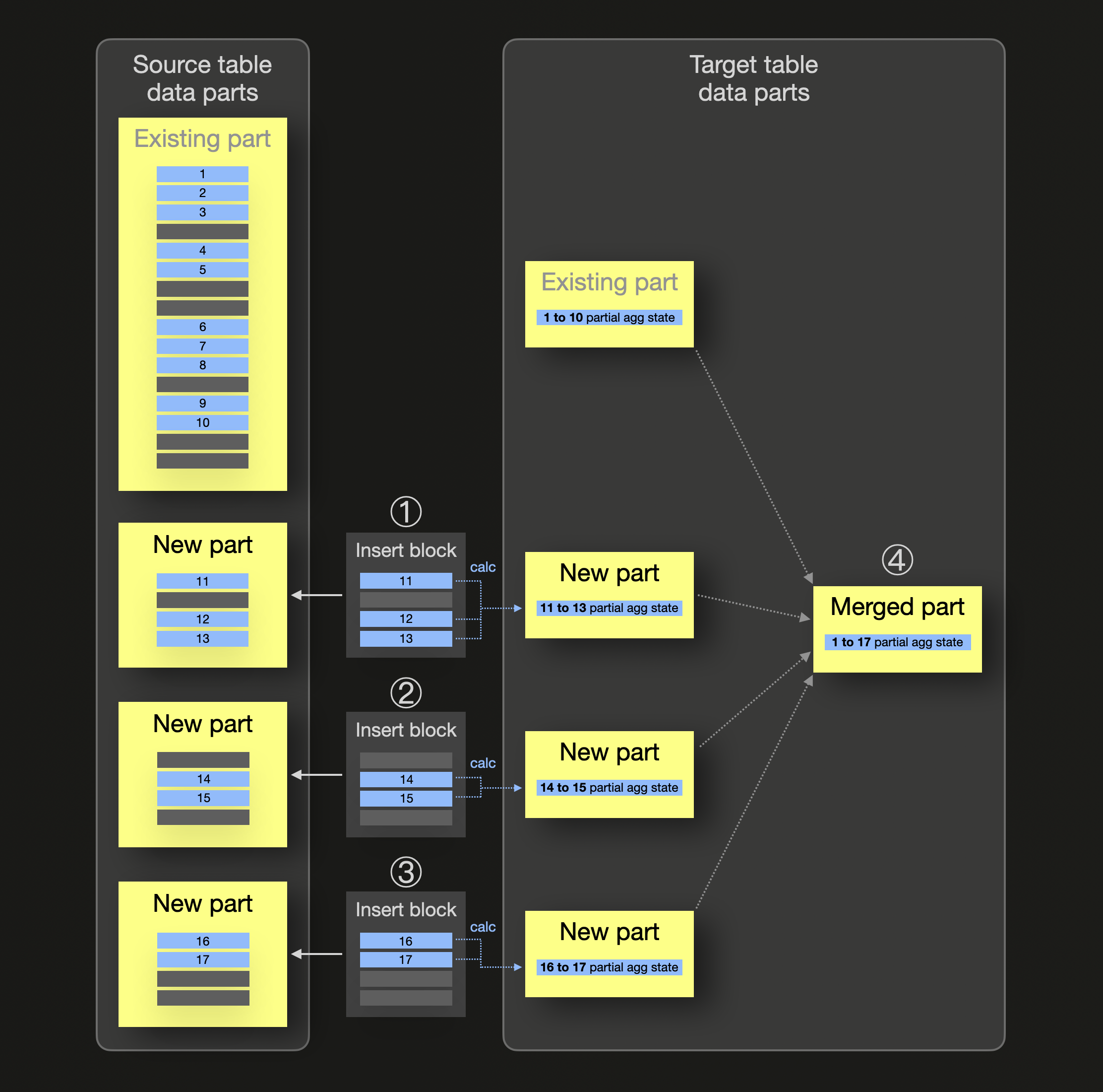 In the diagram above, the materialized view's source table already contains a data part storing some blue rows (1 to 10) belonging to the same group. For this group, there also already exists a data part in the view's target table storing a partial aggregation state for the blue group. When ① ② ③ inserts into the source table with new rows take place, a corresponding source table data part is created for each insert, and, in parallel, (just) for each block of newly inserted rows, a partial aggregation state is calculated and inserted in the form of a data part into the materialized view's target table. ④ During background part merges, the partial aggregation states are merged, resulting in incremental data aggregation.