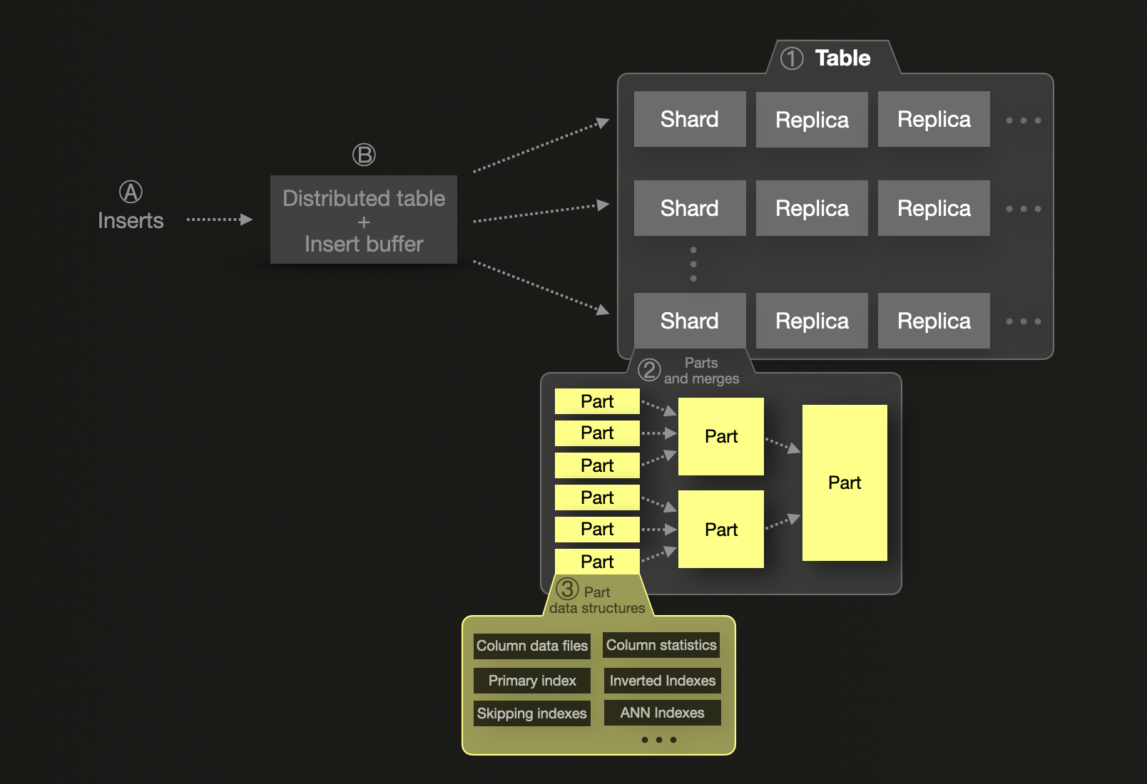 ClickHouse also supports sharding, but its model is designed to favor vertical scaling. A single shard can store trillions of rows and continues to perform efficiently as long as memory, CPU, and disk permit. Unlike Elasticsearch, there is no hard row limit per shard. Shards in ClickHouse are logical — effectively individual tables — and do not require partitioning unless the dataset exceeds the capacity of a single node. This typically occurs due to disk size constraints, with sharding ① introduced only when horizontal scale-out is necessary - reducing complexity and overhead. In this case, similar to Elasticsearch, a shard will hold a subset of the data. The data within a single shard is organized as a collection of ② immutable data parts containing ③ several data structures.