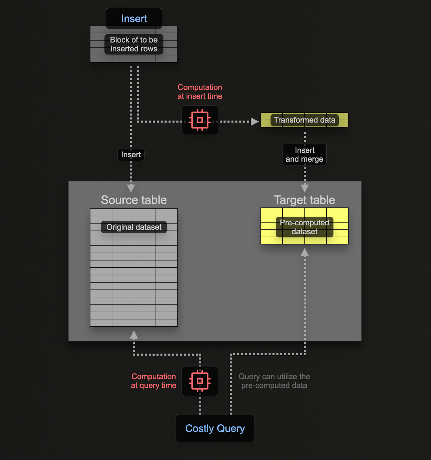 In earlier sections, we explored the use of Materialized views for data transformation and filtering. Materialized views can, however, also be used to precompute aggregations at insert time and store the result. This result can be updated with the results from subsequent inserts, thus effectively allowing an aggregation to be precomputed at insert time.